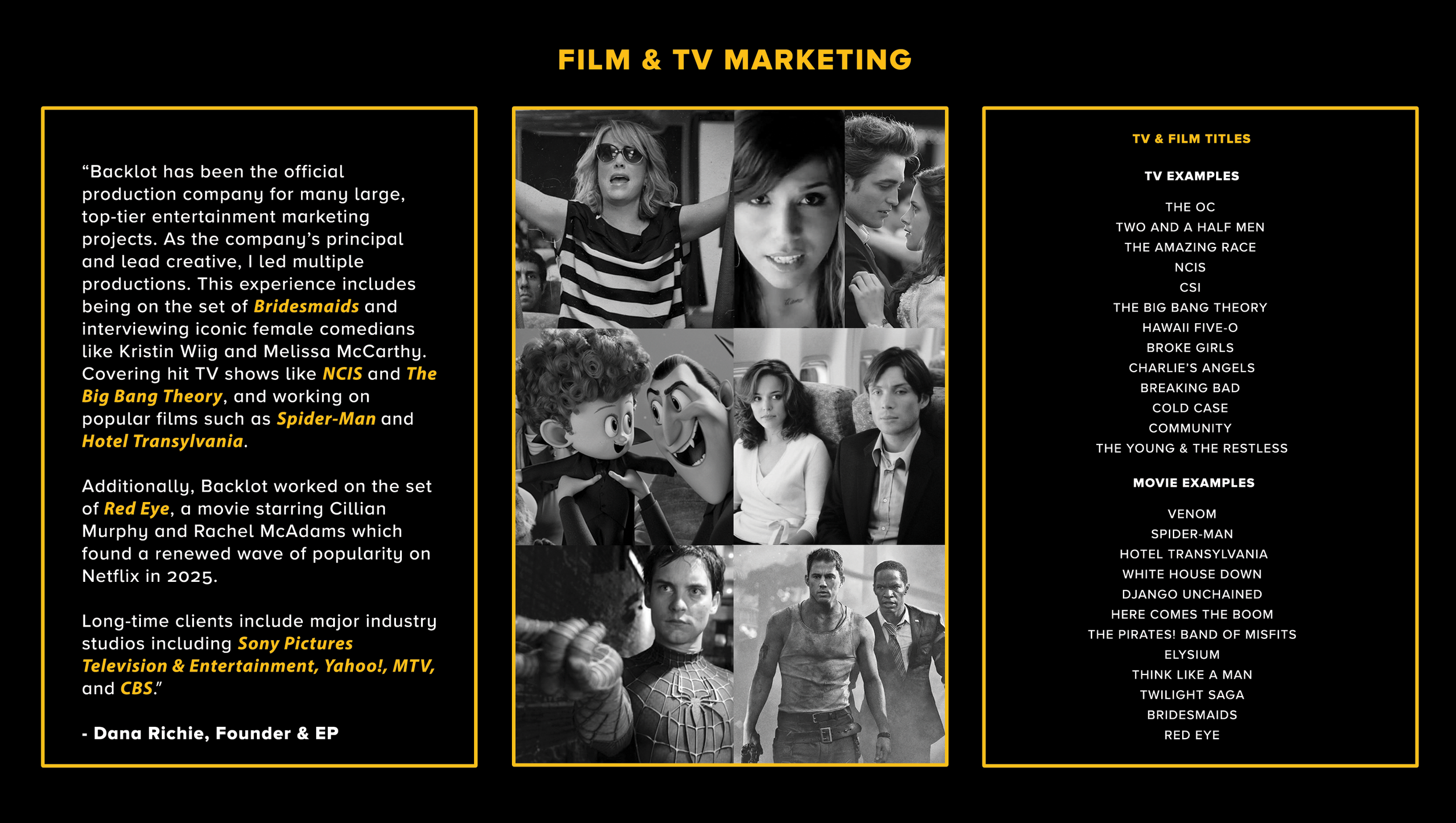 Founded in 2002, Backlot Productions operates at the intersection of brand, culture, and storytelling. Under Dana’s leadership, the company has produced campaigns and original content for global clients including AT&T, Sony, Yahoo!, EMI/Capitol, General Motors, Hennessy, Smartwater, and Bayer, delivering high-profile work that is strategically driven, audience-first, and visually distinctive.